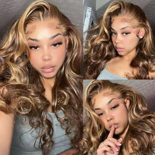 Honey Blonde Ombre Body Wave Hair 13x4 Transparent Lace Front Human Hair Wig Pre Plucked