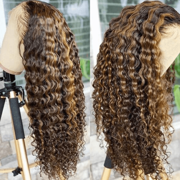 Honey Blonde Ombre Hair P4/27 Deep Curly 4x4 Lace Closure Human Hair Wig